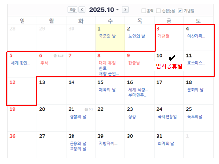 2025년 10월, 하루 임시공휴일 지정되면 열흘 연휴! 지정 여부는 6월 중 확정 예정입니다. 미리 대비해두면 전략적 활용 가능!